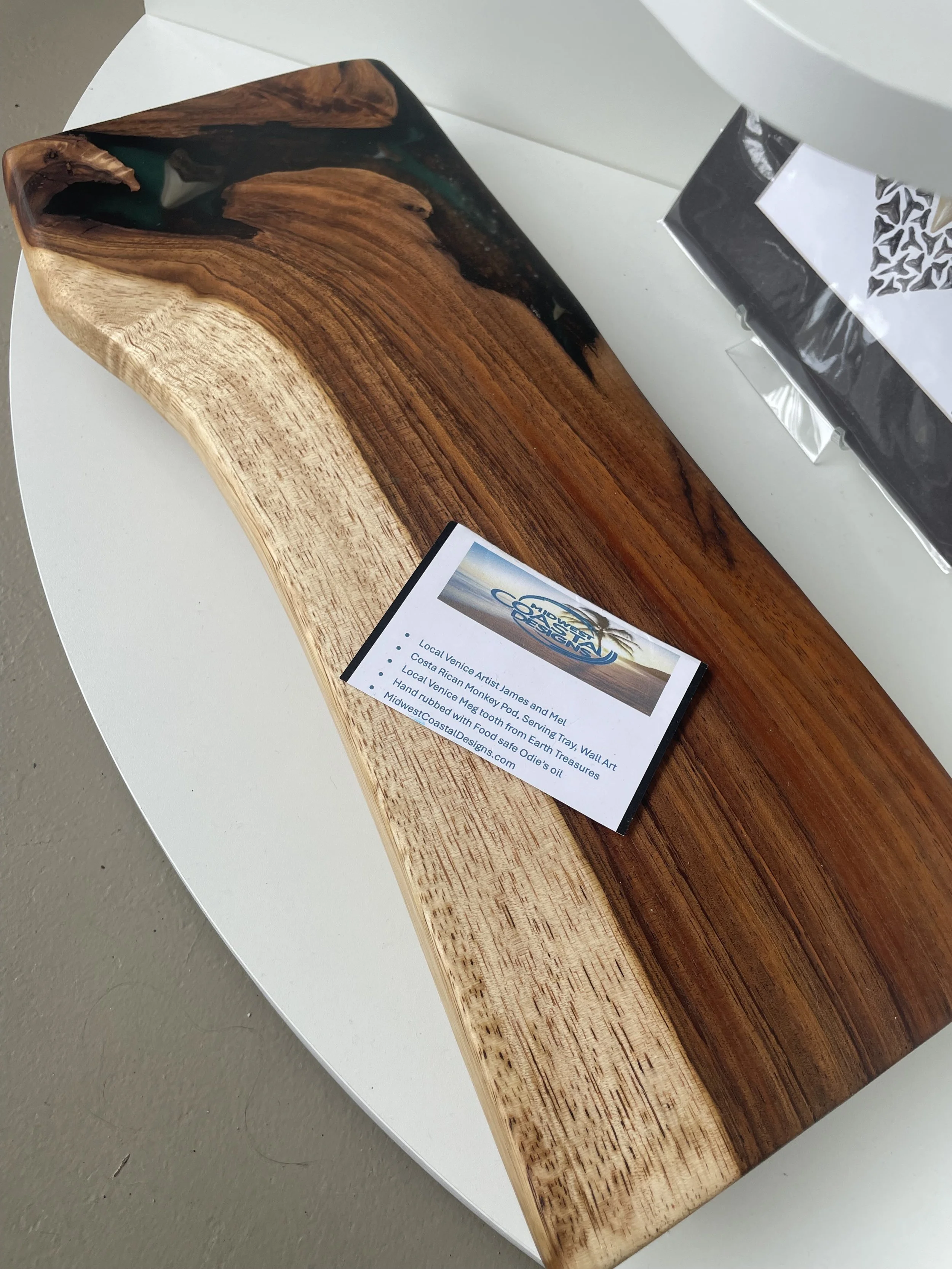 09-10-25 SOLD! This beautiful Monkey Pod with Meg tooth board just sold at Earth Treasures Shop in downtown Venice. We will bringing a replacement center piece and a piece of wall art on Sunday. Stop in and see what all they have available.
