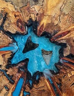 08/31/25 Mel and James from have a new project available for sale. A beautiful Maple live edge slab table with a splash of blue resin filling a small void down the center. There are two small Venice Beach sourced shark teeth in the resin.